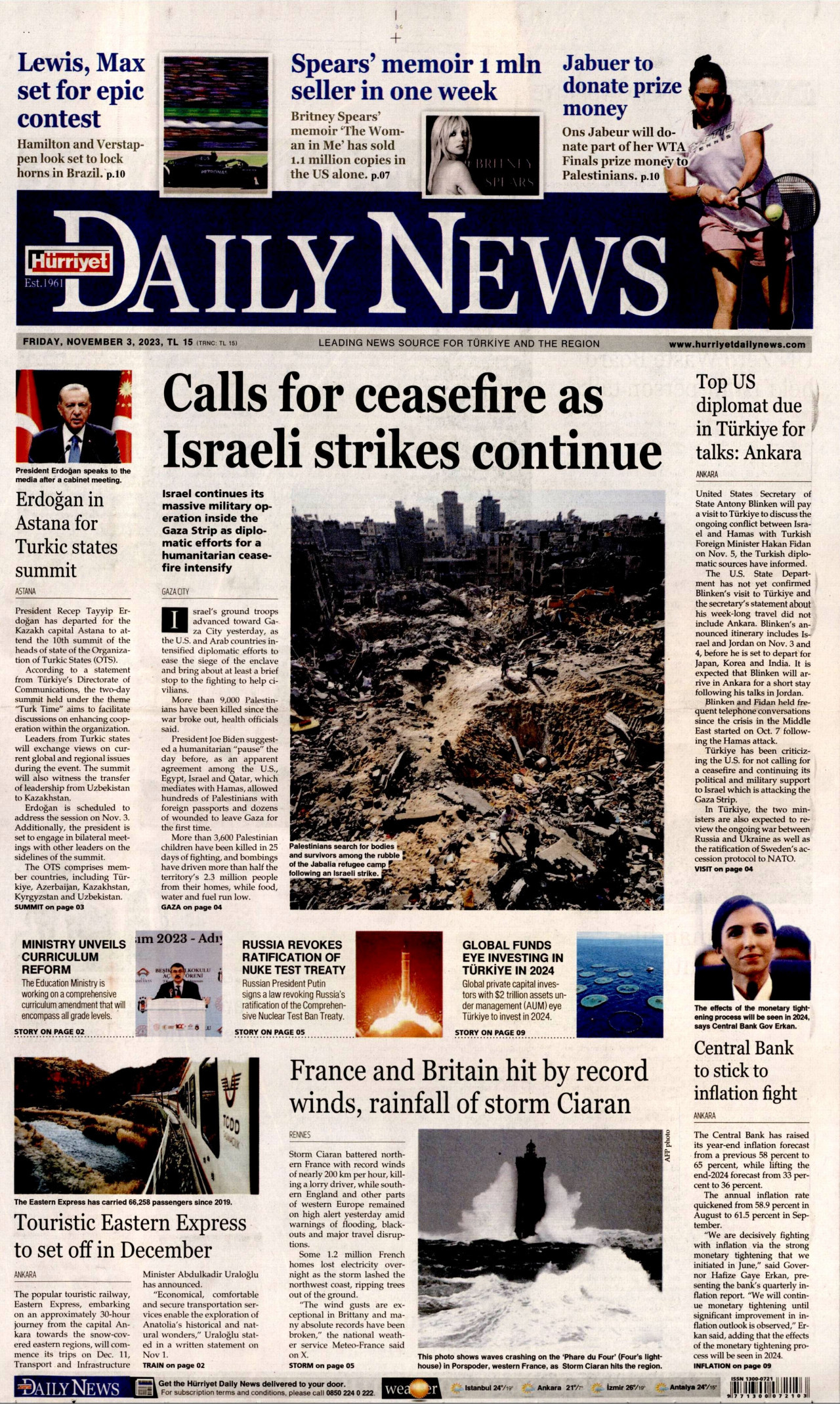 HÜRRİYET DAİLY NEWS Gazetesi 03 Kasım 2023, Cuma Günü Manşeti