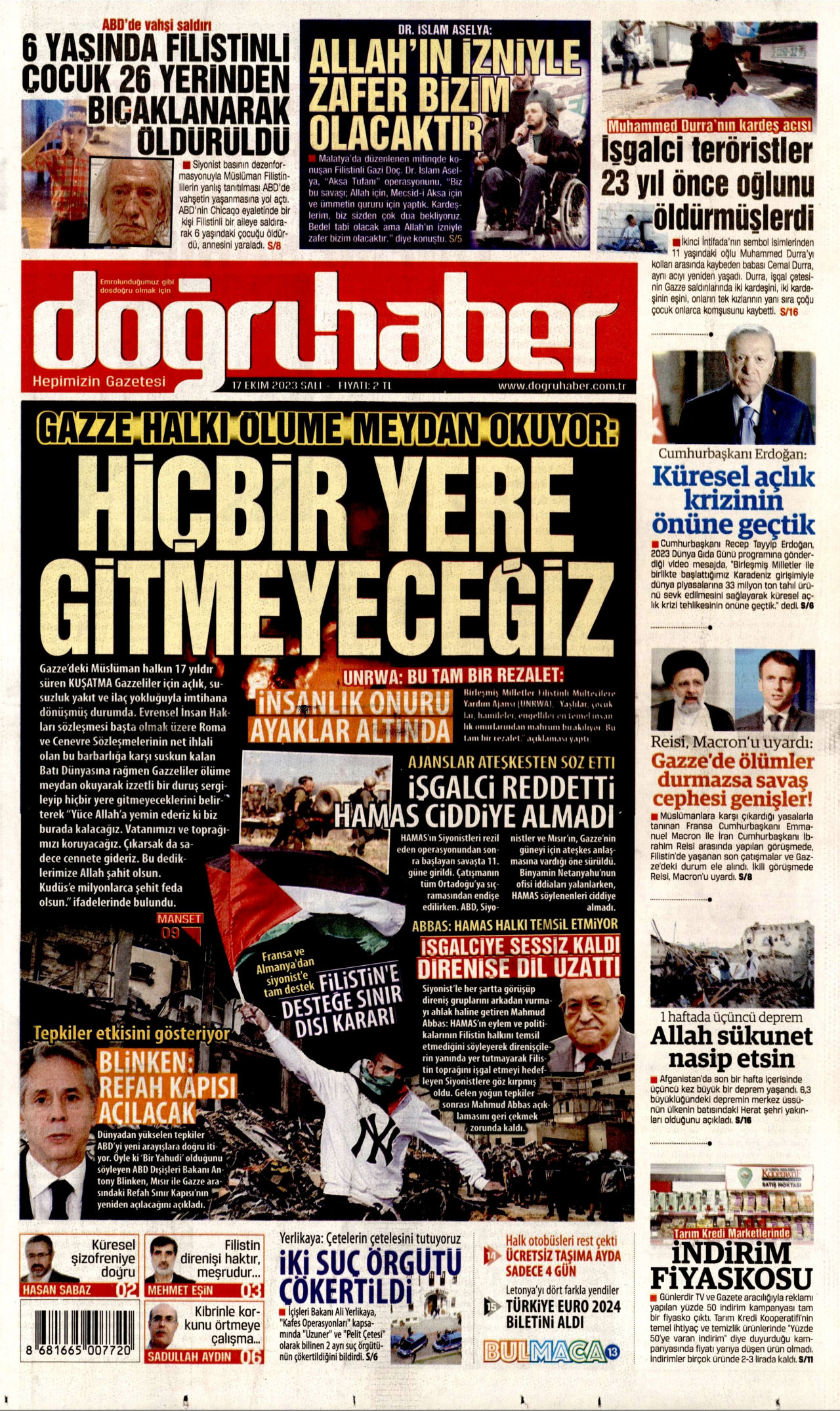 DOĞRU HABER Gazetesi 17 Ekim 2023, Salı Günü Manşeti