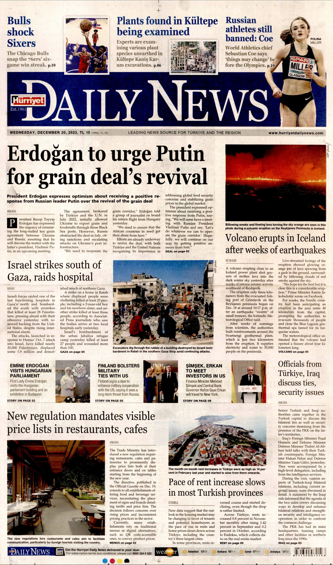 HÜRRİYET DAİLY NEWS Gazetesi 20 Aralık 2023, Çarşamba Günü Manşeti