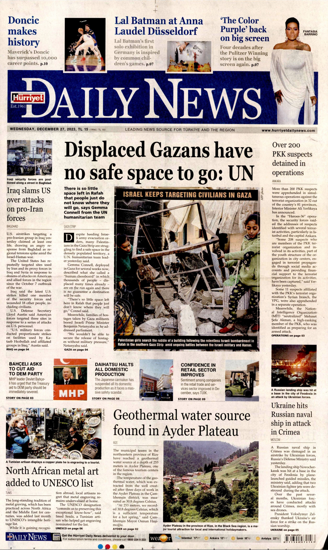 HÜRRİYET DAİLY NEWS Gazetesi 27 Aralık 2023, Çarşamba Günü Manşeti