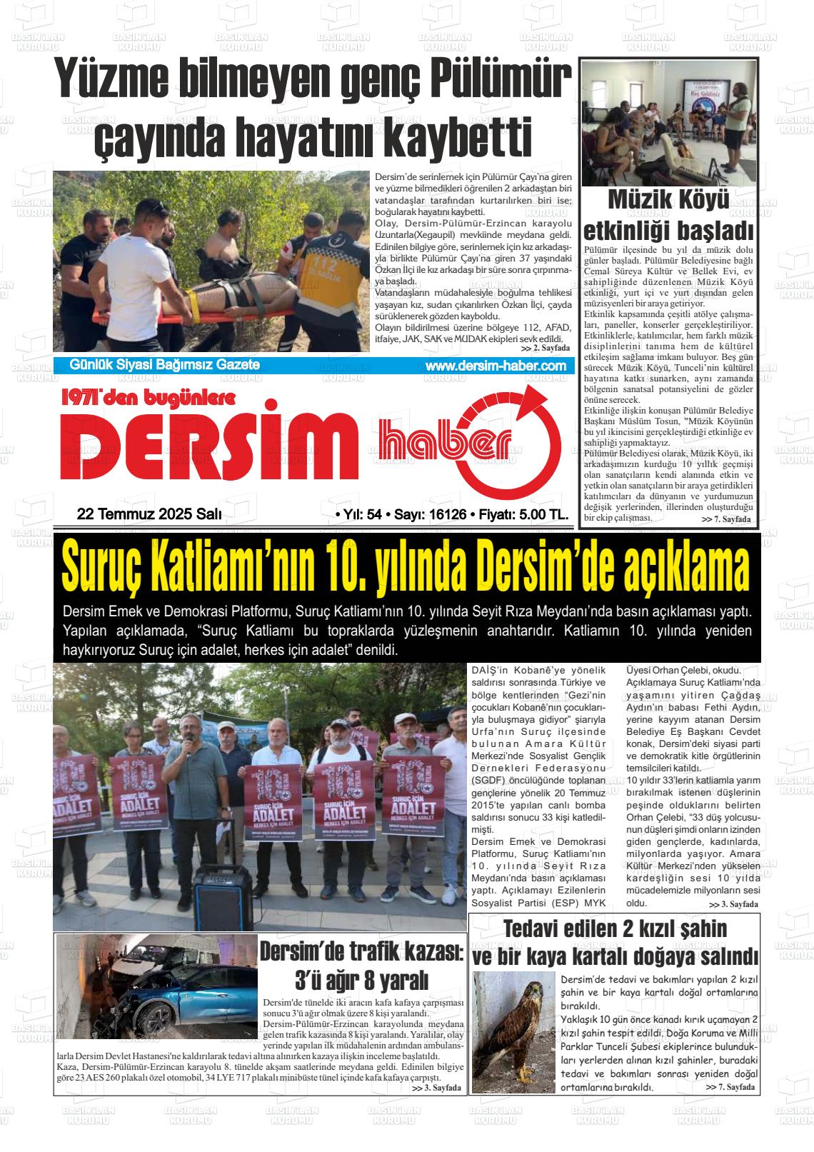 Tuncelİ Yerel Gazeteleri 15 Aralık 2025, Pazartesi Günü Manşeti